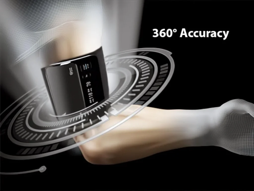 Досягнення точності завдяки унікальній манжеті Intelli Wrap 360° можна охарактеризувати як вражаючу: чутлива зона, що охоплює всі 360 градусів навколо руки, дозволяє проводити вимірювання безперешкодно незалежно від місця накладання на плечі.