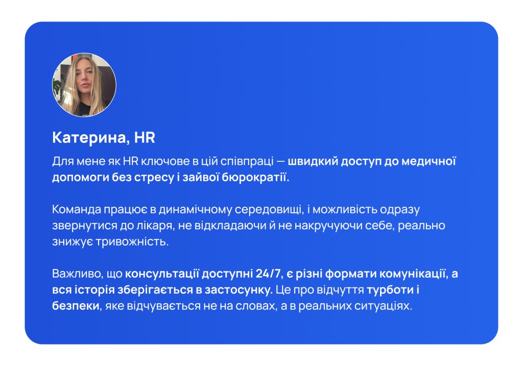 Доступ до якісної медичної допомоги сьогодні напряму впливає на продуктивність, рівень стресу та загальний психологічний клімат у команді. Можливість швидко отримати консультацію лікаря допомагає уникати затяжних лікарняних, своєчасно реагувати на симптоми та підтримувати стабільну працездатність співробітників.
